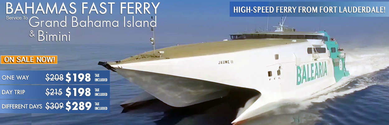 Bahamas Fast Ferry | Grand Bahama Island | Balearia - goBahamasPlus RRP: $309.00 $198.00 (You save $111.00) Prices Listed Are Per Person Book online now. Enter up to 4 passengers per booking page. Select your travel options below & enter all passenger information.